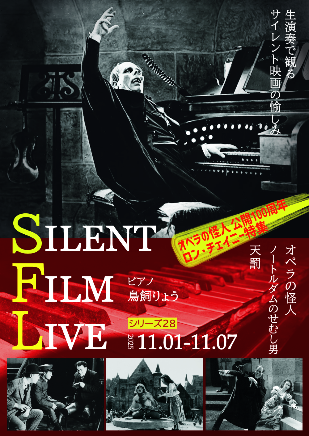 映画が誕生したのは1895年。最初の30~40年間はフィルムに音を付ける技術がなく、映画はスクリーンの横で奏でられる生演奏と共に楽しまれていました。この時代の映画は「サイレント映画(無声映画)」と呼ばれています。「SILENT FILM LIVE」は、そのような当時の上映スタイルでサイレント映画を体験できる上映会です。今回は『オペラの怪人』公開100周年を記念して「千の顔を持つ男」と言われた怪優ロン・チェイニーを特集します。